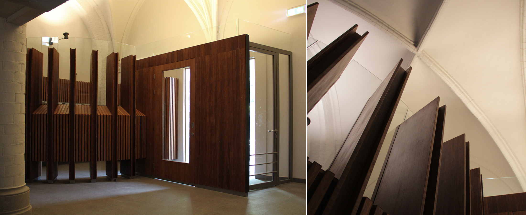 In april 2018 werd gestart met de verbouw van het entreegebied en deze is inmiddels opgeleverd. Achter de met messing beklede entreedeur wordt het voormalig kerkportaal weer helemaal uitgelicht. De bouwdelen uit ’70 zijn bekleed met duurzaam bamboe, evenals de nieuwe separatie met de brievenkasten. Beiden verwijzen naar het oorspronkelijk houten meubilair in een kerk en contrasteren met het wit en grijs van de oorspronkelijke kerk. Frisse accentkleuren en een uitgekiend lichtontwerp maken het plan compleet: in de entreehal ontstaat een bijna mystieke sfeer.